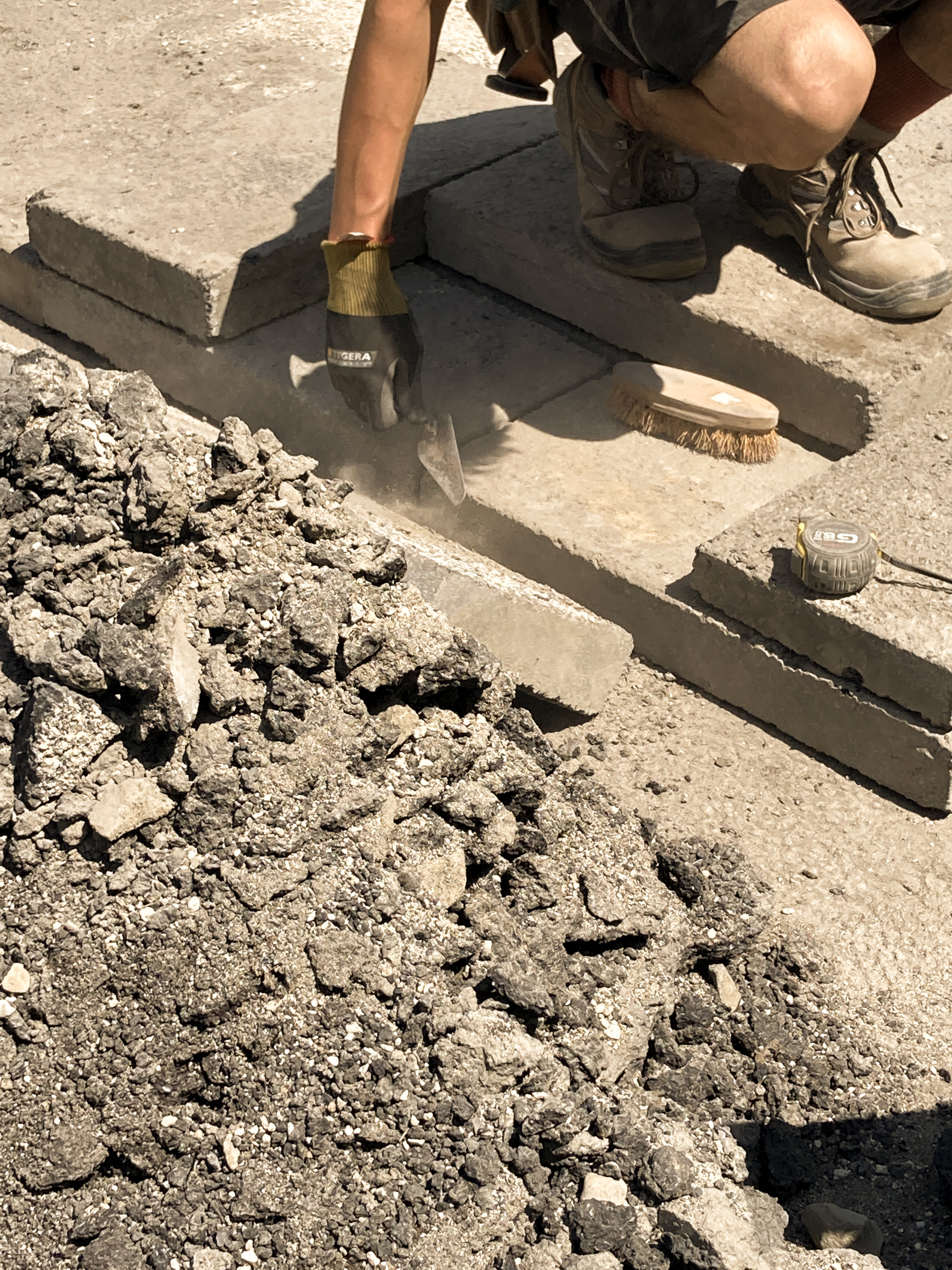 Ce projet, mené en concertation avec les habitants, s’inscrit dans une logique de transformation douce des espaces et des sols : introduire le minimum de matériaux extérieurs et réemployer au maximum ceux générés par les interventions. Ainsi, la terre issue du creusement des noues devient des buttes de plantations aromatiques, l’asphalte retiré pour redonner place au sol végétal et infiltrant est transformé en blocs de matière utilisés pour enrichir les nouveaux espaces créés.